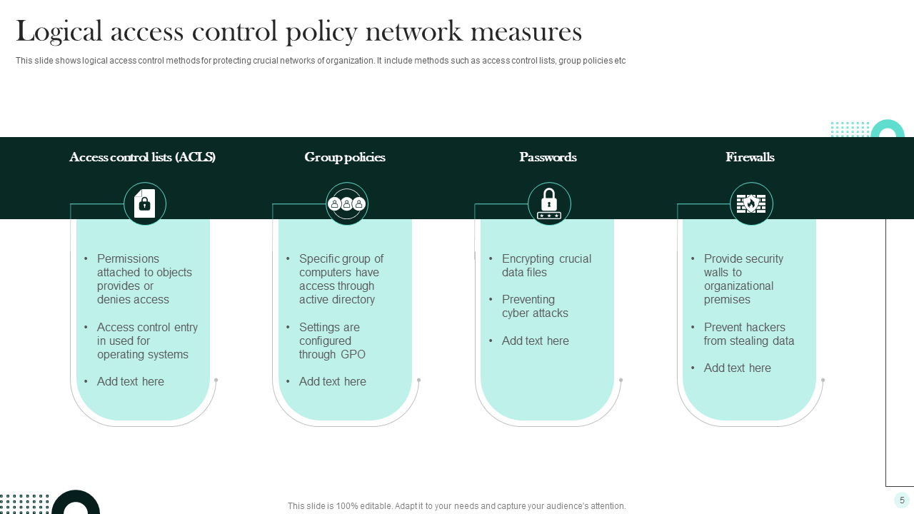 A Logical Access Control Policy Template is only as effective as its adoption and understanding within the organization. Therefore, its design, usability, and implementation strategy are crucial. Firstly, aim for clarity and conciseness. Avoid overly technical jargon where possible, or provide clear explanations. Use plain language that all employees, regardless of their technical background, can understand. Well-structured headings, bullet points, and an intuitive layout can significantly improve readability.