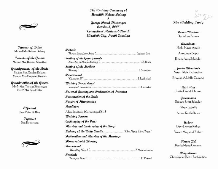 - **The Order of Service:** This is the heart of the program, detailing each part of the ceremony in chronological order. Include titles for each section, such as the **Prelude**, Processional, Welcome, Opening Prayer, Hymn/Song, Scriptural Readings, Homily/Sermon, Exchange of Vows, Blessing and Exchange of Rings, Unity Ceremony (if applicable), Lord’s Prayer, Benediction, and Recessional.