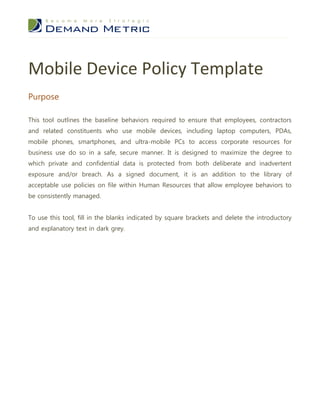 • Definitions: Provide clear definitions for key terms like "sensitive data," "mobile device," "personally identifiable information (PII)," and "remote wipe" to avoid ambiguity.