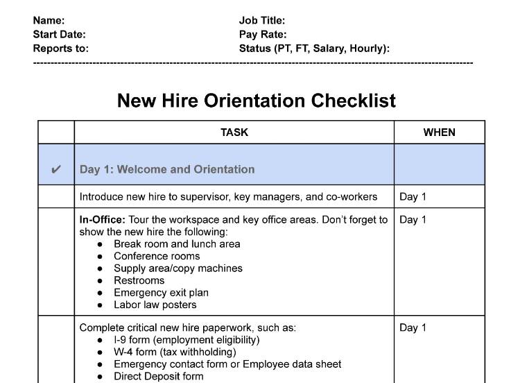 - Review of employee handbook and key policies (**PTO, sick leave, expense reports**).