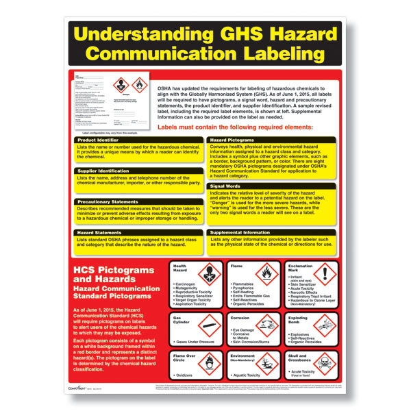 - **Labeling:** A clear explanation of the workplace labeling system. This must include provisions for ensuring that all containers of hazardous chemicals are appropriately labeled with product identifier, hazard statements, pictograms, and precautionary statements.