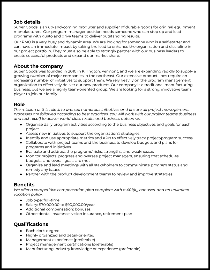Beyond skills and experience, a successful program manager also needs to thrive within the company’s specific environment. Briefly describing the company culture, values, and work environment can help candidates gauge their potential fit. This might include mentioning team collaboration styles, innovation focus, work-life balance initiatives, or opportunities for professional development. This insight helps candidates determine if the organization is the right cultural match for their professional aspirations.