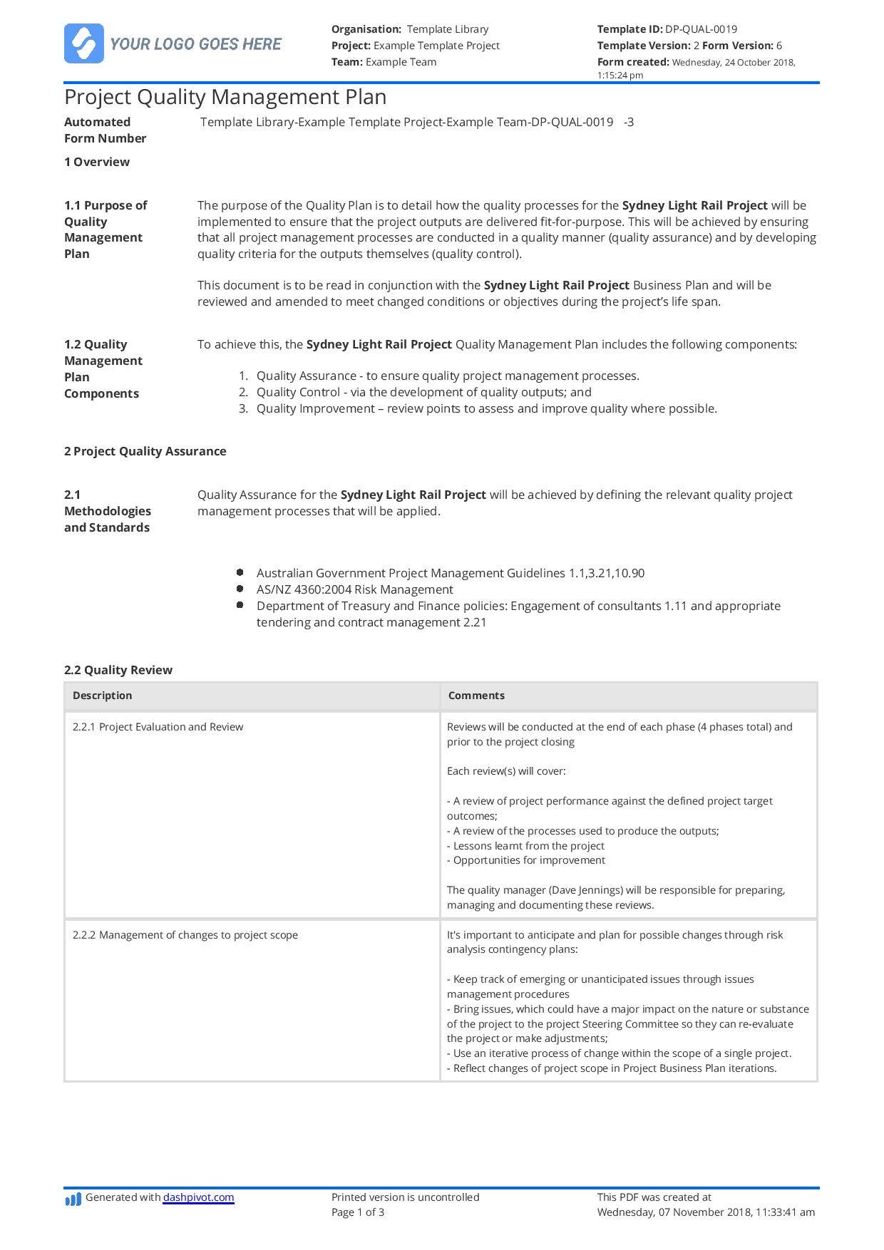 - Methodology/Approach: A high-level description of the organization’s approach to quality management, which might reference specific frameworks (e.g., PDCA cycle) or standards (e.g., ISO 9001).