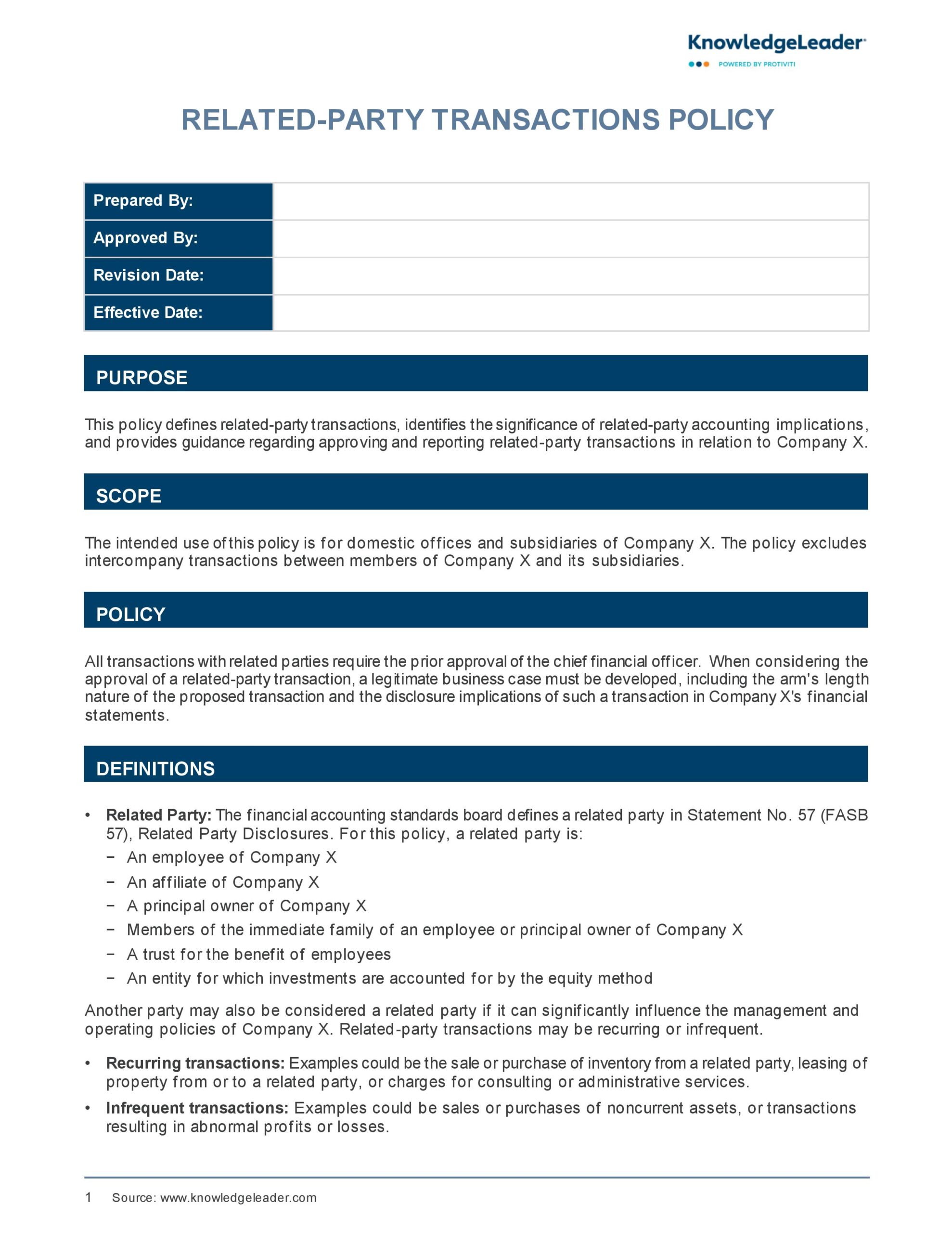 - Annual Review and Update: Specify that the Related Party Transaction Policy Template itself will be reviewed and updated periodically to reflect changes in regulations, best practices, or the organization’s structure.
