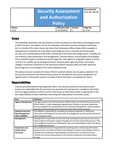 - Policy Statement and Purpose: Clearly define the policy’s objective, scope, and the organization’s commitment to security assessment and authorization.