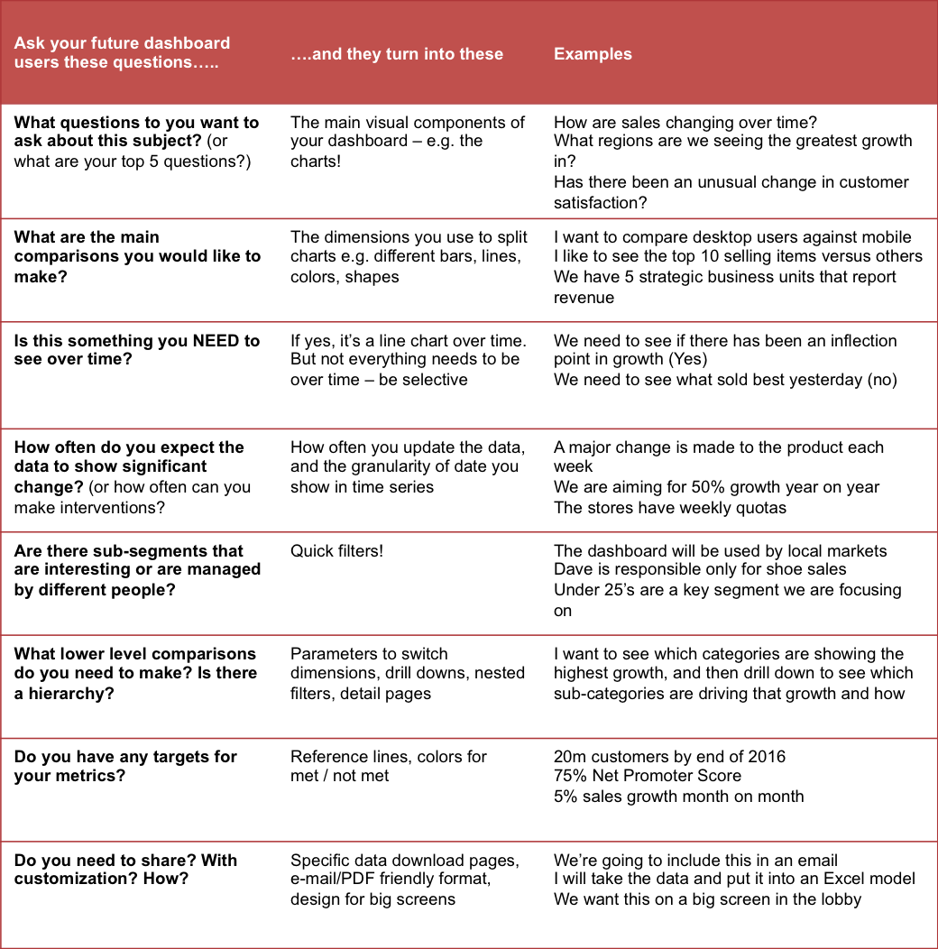 - **Business Questions:** List the precise questions the dashboard must answer. This is perhaps the most critical section, guiding all subsequent design decisions.